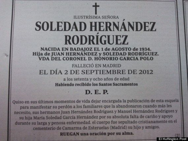 A Soledad Hernández Rodríguez no le bastó con encargar una esquela para perdonar a sus hermanos y a su hija "por su absoluta falta de cariño" y quiso plasmar en piedra su malestar con ellos con la siguiente frase: