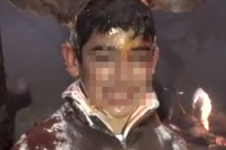 Las imágenes muestran al niño atado a un palo. Tras verter sobre él un bote entero de pimentón, le restregan por la cara un trozo de piel del animal recién cazado para diversión de los asistentes quienes reclaman a gritos que le pongan "la cabeza del venao".