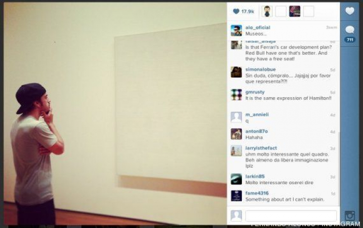 "Museos...", escribió con sorna Fernando Alonso al colgar en su cuenta de Instagram su foto de concentración ante un cuadro en blanco. Un lienzo en blanco que se ha convertido en marco para montajes del piloto.