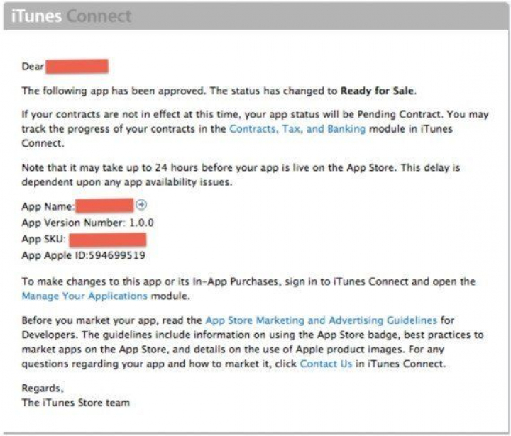 Carta de iTunes anunciando a los investigadores que su app había "colado"