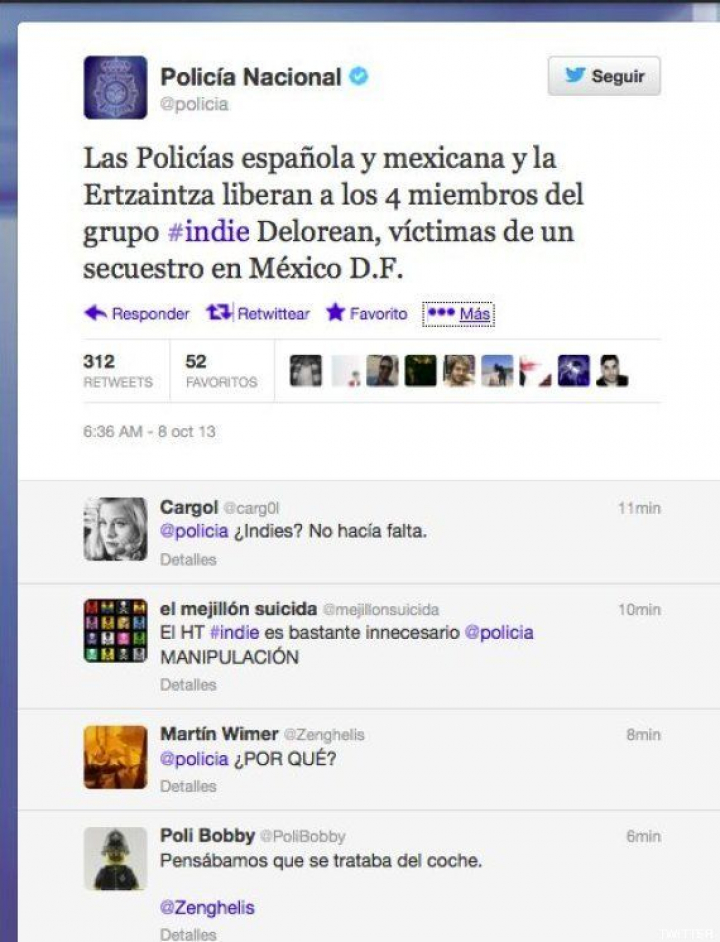 El "secuestro virtual" de Delorean en México, y la puesta en libertad de los cuatro miembros del grupo, ha sido anunciado por la Policía en Twitter.