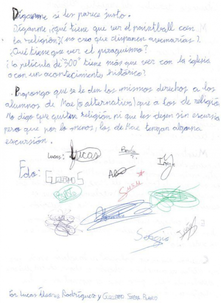 "Los niños que van a religión hacen excursiones sin nosotros (...) y no sólo eso. Además ven películas, van a ordenadores, a jugar al paintball (guerra de bolas de pintura), piragüismo, al teatro, al cine...". Lucas, que firma la carta junto a otros 12 compañeros, se queja de que, en cambio, las horas de su asignatura las dedican sólo a dibujar y a hacer deberes. Por eso, piden que se "equilibren" las actividades de ambas materias.