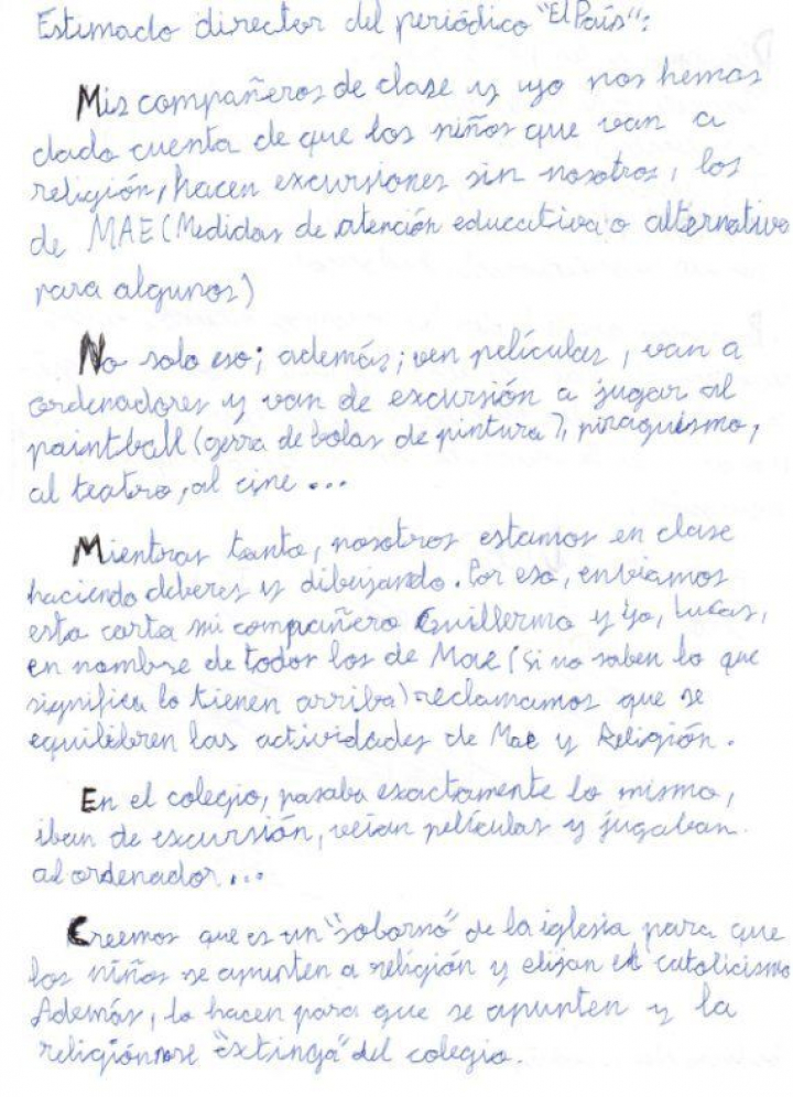 Por eso, ha enviado una carta al director de El País, que también ha sido remitida a El Huffington Post por sus padres, en la que vuelca toda su indignación. En dos folios escritos a mano, explica que cursa Medidas de Atención Educativa (MAE), la alternativa a religión, y se queja de la discriminación según la materia que se elija.