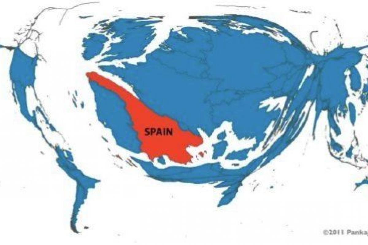 (En este mapa, correspondiente a los años 2007-2009 pero en el que apenas se han producido cambios, el tamaño de los países se muestra en función de lo que a ellos exportan las empresas españolas. Los colores indican la parte de las importaciones de los países que corresponde a empresas españolas. Cuanto más cálido, mayor es esa proporción).
