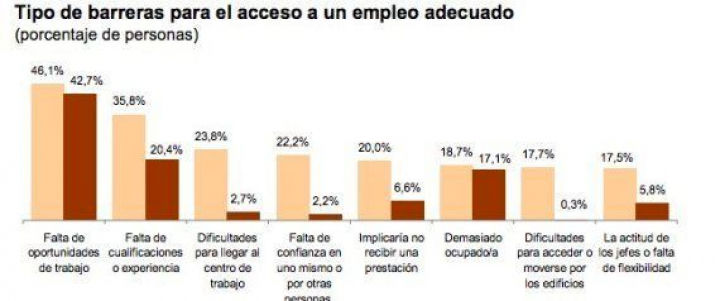 Casi la mitad de los encuestados aseguran que no pueden acceder a un empleo adecuado principalmente por falta de oportunidades de trabajo (41%) o por falta de experiencia o cualificación (20,4%) porcentajes que se elevan al 84,2% y 31,2%, en el caso de los desempleados y al 46,1% y 35,8%, en el de las personas con discapacidad.
