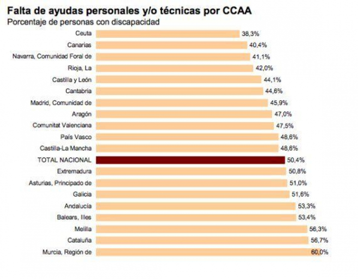 Las comunidades autónomas que presentan mayores tasas de población que declara discapacidad son Andalucía (19,8%), Región de Murcia (19,6%), y Principado de Asturias (19,1%), mientras que Aragón (12,6%), Illes Balears (12,9%) y Comunidad Foral de Navarra (13,6%) son las que menos.