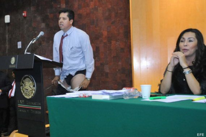 Curiosa imagen en el Parlamento de México, donde Antonio García Conejo, diputado del izquierdista Partido de la Revolución Democrática, se ha quedado en calzoncillos en el Pleno de la Cámara de los Diputados para mostrar su oposición a la reforma energética.