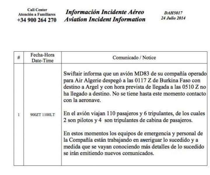 El avión, modelo MD83, pertenecía a la empresa española Swiftair, pero estaba operado por Air Algerie. Con código de vuelo AH5017 despegó a la hora prevista, las 1.17 horas GMT (3.17 en la España peninsular). Sin embargo, unos 50 minutos después, mientras sobrevolaba Mali, se perdió el contacto con el aparato, que tenía previsto llegar a las 7:10 hora peninsular a Argel.