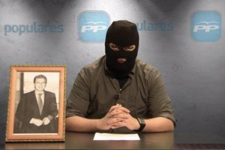 Este es el vídeo, en el que el humorista, que aparece con un pasamontañas que le tapa el rostro y junto a una fotografía del encarcelado Francisco Granados, lee un supuesto comunicado en nombre del PP en el que se anuncia el cese de "su actividad armada", la entrega de armas y que "varios de sus miembros se integrarán en la vida política a través de partidos como VOX o UPyD".