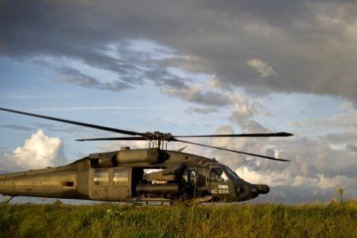 An artillery helicopter of the Colombian Air Force refuels at Carano airport in Quibdo, Department of Choco, Colombia, on November 20, 2014, before heading to reinforce search operations for General Ruben Alzate, who was kidnapped by the Revolu...LUIS ROBAYO via Getty Images