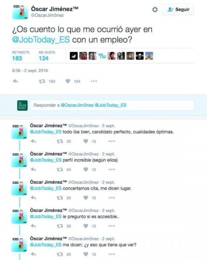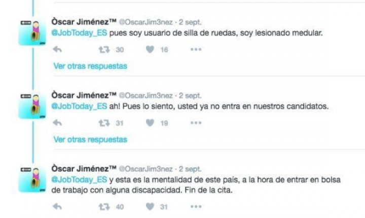 Este hombre de 34 años publicó el viernes una queja en Twitter que ha tenido repercusión en la red social. Entró en un proceso de selección para gestionar las redes sociales de dos empresas. Todo iba bien. En la compañía le habían asegurado que tenía las cualidades que buscaban, que prácticamente era el candidato perfecto. Pero todo se torció cuando dijo que era lesionado medular.