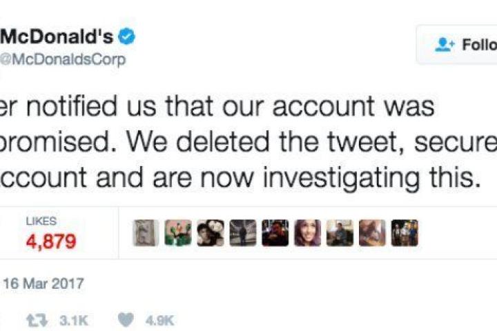 El mensaje de McDonald's fue borrado a los pocos minutos y sustituido por este otro, en el que la empresa aseguraba que habían 'hackeado' su cuenta y que estaban investigando qué es lo que había ocurrido: