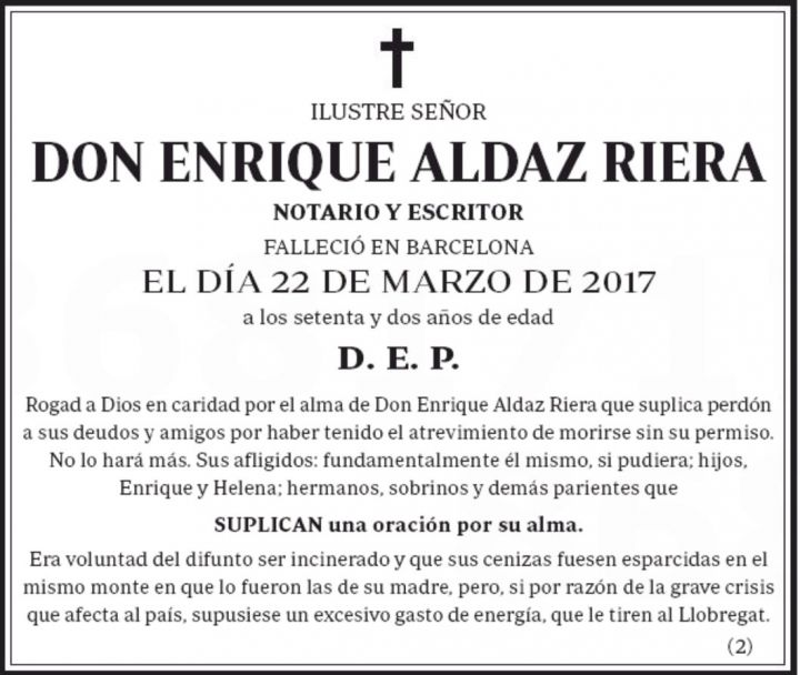 La esquela pertenece a Don Enrique Aldaz Riera, un notario y escritor que falleció el pasado día 22 de marzo en Barcelona a los 72 años de edad.