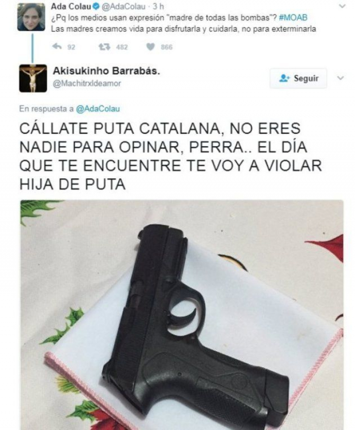 Desde una cuenta firmada con el pseudónimo "Akisukinho Barrabás", un usuario cuyo nombre no ha trascendido ha respondido con insultos y amenazas a un tuit de Colau en el que se quejaba de que los medios de comunicación utilizaran la expresión "madre de todas las bombas" para referirse al explosivo de gran potencia lanzado la semana pasada por los EEUU en Afganistán.