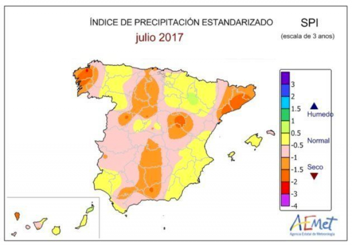 Mapa de vigilancia de la sequía meteorológica en España de los tres últimos años.AEMET