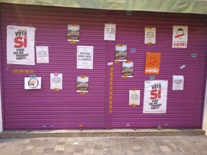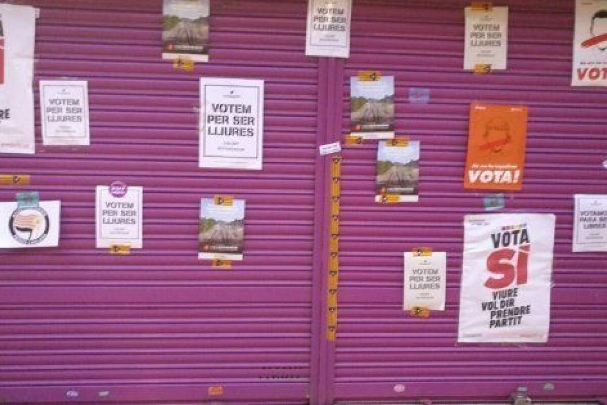 Junto a estas pintadas han aparecido también varias pegatinas y carteles independentistas en los que puede leerse "Votemos para ser libres", "!Vota!", "Vivir quiere decir tomar partido" o la imagen del anuncio oficial de la Generalitat sobre el 1-O en el que aparecen dos vías de trenes.
