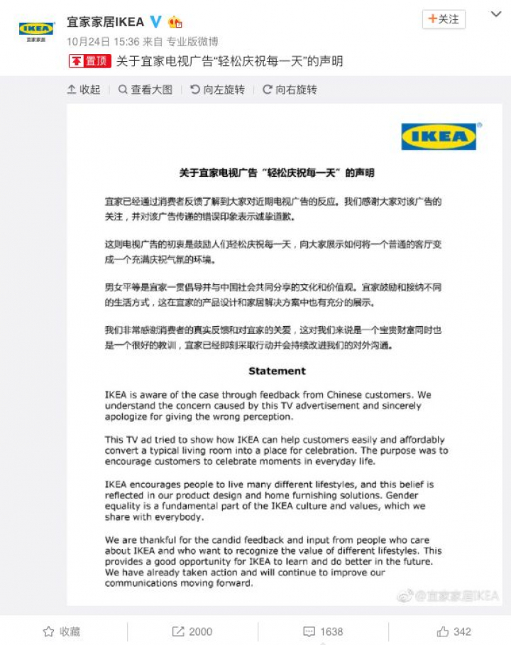 Ikea pidió disculpas este martes por el desacertado anuncio en Weibo, el servicio de micro-blogging chino similar a Twitter: