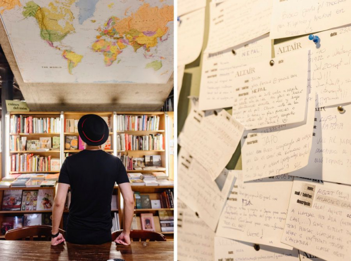 Nada más entrar, Philip se topa con un atrayente tablón de anuncios. Lee atentamente: aficionados a los viajes que visitan la tienda buscan nuevos compañeros para emprender emocionantes aventuras. Bajo el mismo techo, decenas de mapas cubren la parte superior de las estanterías, mientras que otros exóticos objetos (disponibles, y a la venta) pueblan las vitrinas del lugar. Philip cierra los ojos y saborea el espíritu del espacio. Dejarse llevar a otro lugar nunca había sido tan fácil.