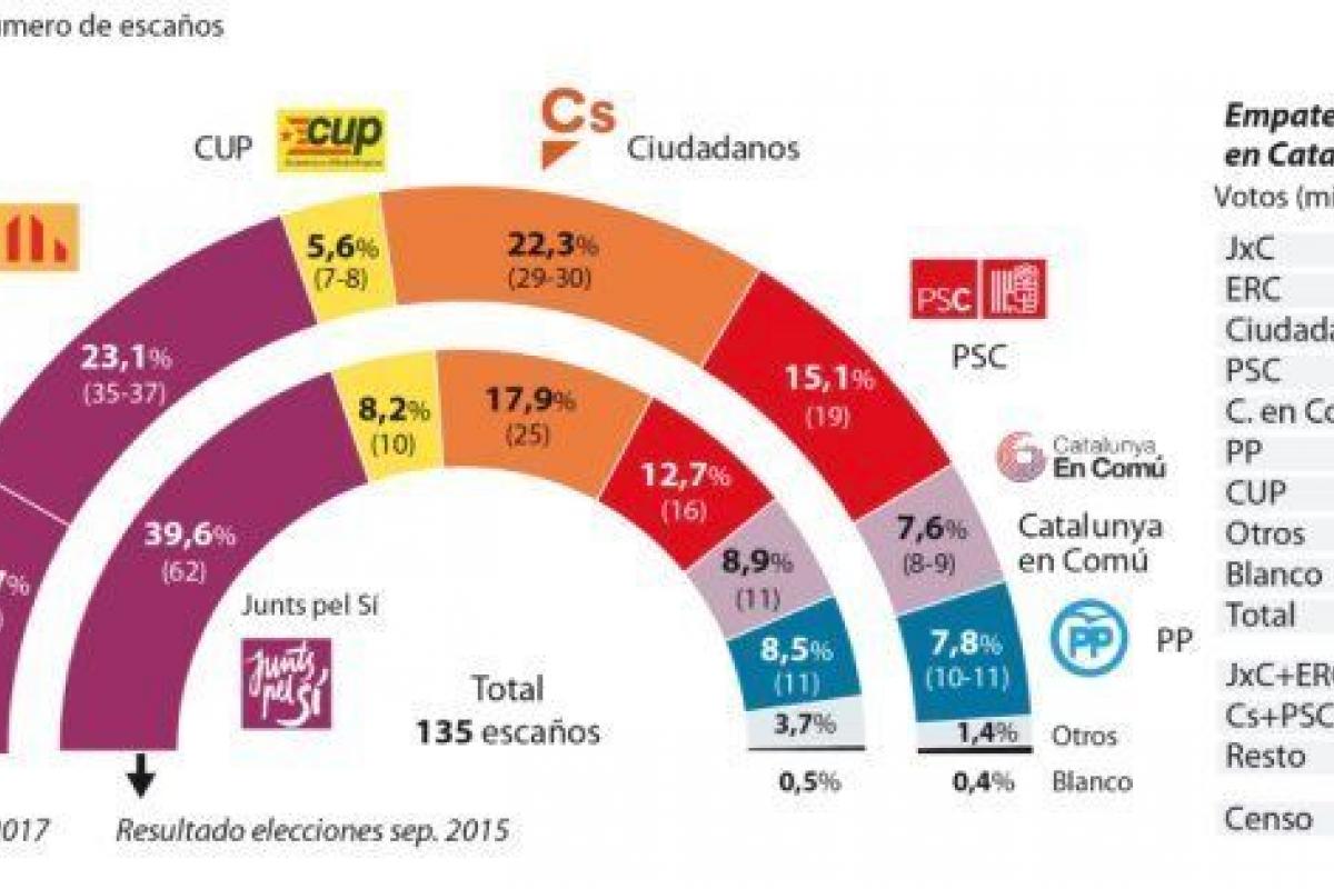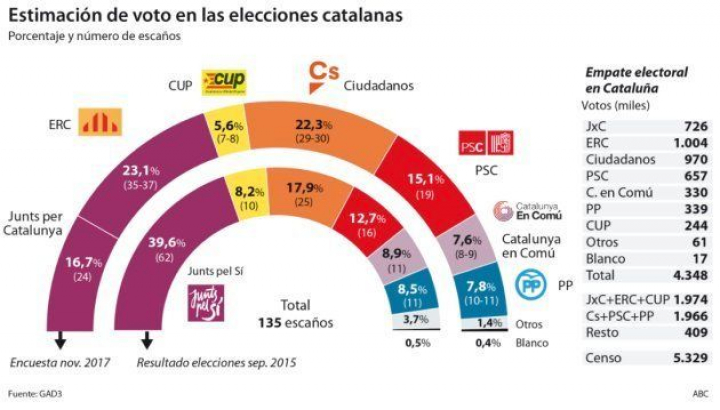 Así se desprende de una encuesta de GAD3 para el diario ABC realizada entre los pasados 13 y 16 de noviembre mediante 801 entrevistas telefónicas en Cataluña. La coalición Junts pel Sí (PdeCat y ERC) logró en las elecciones de septiembre de 2015 un 39,6% de los votos, un porcentaje similar al que, ahora por separado como Junts per Catalunya (PdeCat) y ERC, obtendrían según la encuesta: un 39,8 por ciento, el 16,7% -24 escaños- los primeros y el 23,1% -entre 35 y 37-, los segundos.