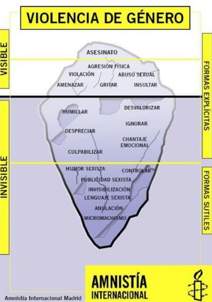 Los asesinatos machistas y las agresiones sexuales son sólo la punta del iceberg. Pero hay mucho más: el lenguaje machista, los insultos, los gritos, la publicidad sexista, la anulación, los micromachismos... Hace años, Amnistía Internacional hacía pública este foto para explicar todo lo qué hay detrás de los asesinatos machistas.