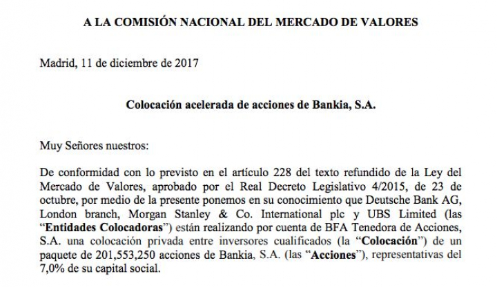Luis de Guindos y José Ignacio Goirigolzarri habían anunciado en muchas ocasiones desde el pasado verano que se llevaría a cabo esta nueva colocación de acciones de Bankia. La operación estaba prevista inicialmente para octubre. Sin embargo, la absorción de BMN y, principalmente, la inestabilidad creada por la situación en Cataluña habían retrasado los planes del Ejecutivo.