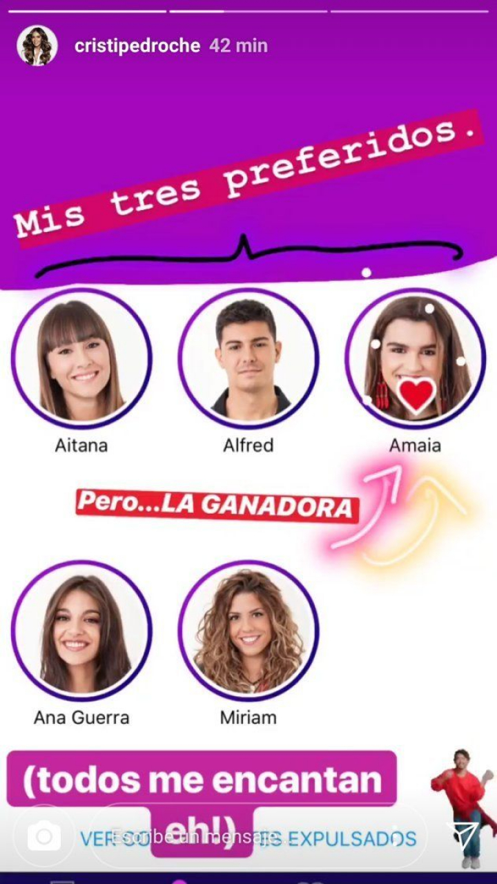 Este lunes 5 de febrero es la gran final de Operación Triunfo y conforme se va acercando el momento de conocer los ganadores, las apuestas se van animando. Cristina Pedroche ha sido la última en mojarse en su porra para esta noche y ha publicado un stories en su cuenta de Instagram en el que señala a sus favoritos dentro de la Academia. Compruébalo tú mismo (redoble de tambores).