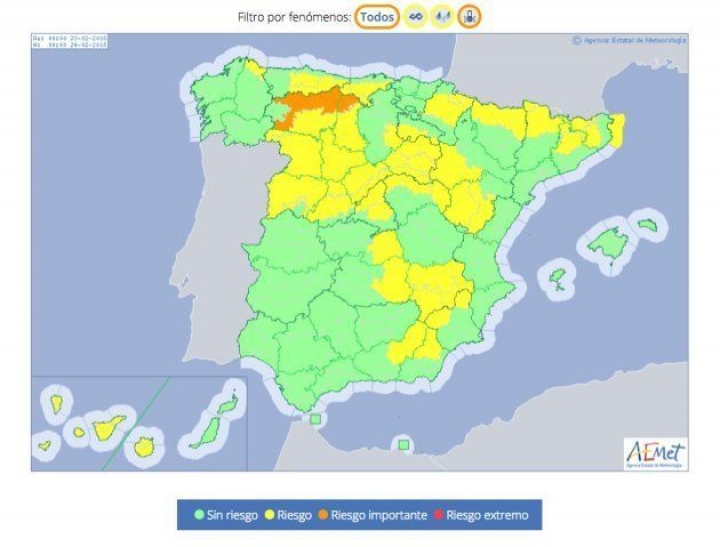 La predicción señala que habrá temperaturas mínimas de entre 4 y 6 grados negativos en zonas del interior de Cantabria y en las provincias de Ávila, León, Palencia, Segovia y Soria, sobre todo en las inmediaciones de áreas montañosas. También en la Comunidad de Madrid y prácticamente en toda la zona norte de la Península Ibérica los termómetros bajarán por debajo de cero, con especial atención a la zona de los Pirineos, en Aragón y Cataluña. Medio país estará, pues, en alerta amarilla o naranja por esta bajada de temperaturas y sus consecuencias.
