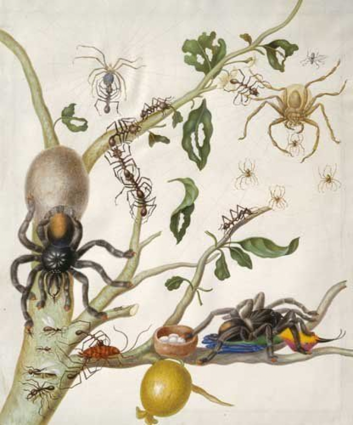 Cuando años después una epidemia traspasó los muros del castillo y mató a muchos de los fieles, entre ellos a su madre y a su medio hermano, Maria y sus hijas se establecieron en Ámsterdam, donde a Maria no le costó trabajo integrarse en el gremio de los dibujantes y mantenerse con su pintura, retomando también sus tareas de maestra de pintoras. Allí descubrió los maravillosos insectos disecados del museo de la ciudad, entre los que destacaban los que habían llegado del otro lado del Atlántico. Escarabajos, mariposas y arañas de tamaño descomunal y colores deslumbrantes debieron fascinar a Maria de tal modo que decidió ir al país donde crecían todas esas bestezuelas. Tenía que verlas vivas, luciendo todo su esplendor, y averiguar si sufrían metamorfosis similares a las que ella había observado en los insectos europeos.