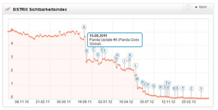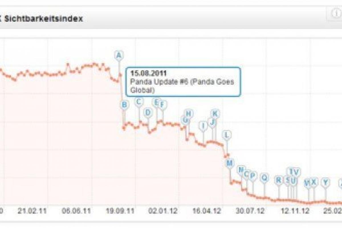 El día 15 de agosto del 2011, la página perdió la mitad de su tráfico coincidiendo con el momento en el que Google lanzó a nivel mundial el algoritmo Panda (A). Esto es una clara señal de que el contenido de esta página o bien era escaso o había sido copiado de otros sitios.