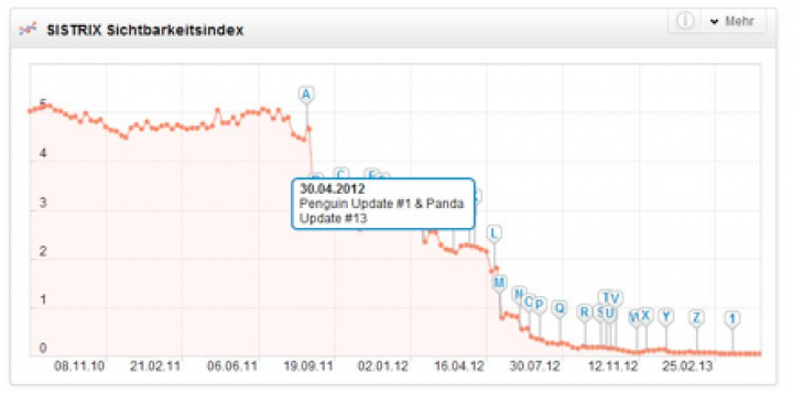 La primera herramienta que podemos usar se llama Sistrix. Este software de análisis indica en qué momento ha sido penalizada la web. Para ello, incluye una función muy interesante que permite ver, según la fecha, cuándo ha puesto en funcionamiento Google sus cambios de algoritmo. En caso de que la caída de tráfico coincida con la puesta en marcha de un algoritmo u otro, sabremos si lo que falla es el contenido (por acción del algoritmo Panda) o los enlaces entrantes que tiene nuestra página (algoritmo Pingüino).