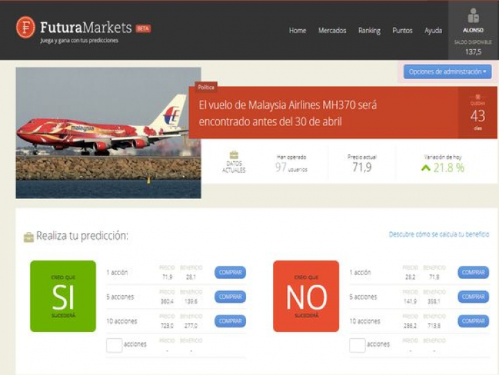 Por ahora los inversores predicen en FuturaMarkets.com que existe un 70% de probabilidades de que las autoridades oficiales encuentren la aeronave. Algo que no deja de tener su incertidumbre puesto que desde 1948 conocemos 83 vuelos que han desaparecido, y de 80 de ellos nunca más se supo nada. Sin embargo, en esta ocasión parece que los usuarios de los mercados de predicciones apuestan porque la tecnología es mejor y la voluntad de encontrar el avión hará posible encontrar el aparato... en algún punto.