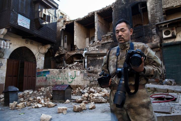 Toshifumi Fujimoto para en mitad de una calle del viejo Alepo para fotografiar parte de la destrucción causada por la artillería del régimen. El nipón se toma su tiempo mientras desde ambos lados de la calle los rebeldes le gritan «Corre, corre... hay francotiradores.