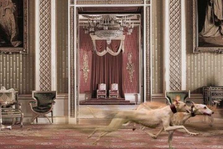 Galgos atravesando el salón del trono de Buckingham Palace.