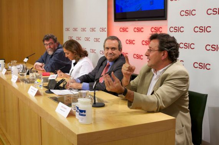Presentación del proyecto Malaspinomics a los medios. De izquierda a dcha: Josep M. Gasol (CSIC), Carmen Vela (secretaria de Estado de Investigación, Desarrollo e Innovación), Emilio Lora Tamayo (presidente del CSIC), y Carlos M. Duarte (CSIC). Photo: Joan Costa, Expedicion Malaspina 2010.