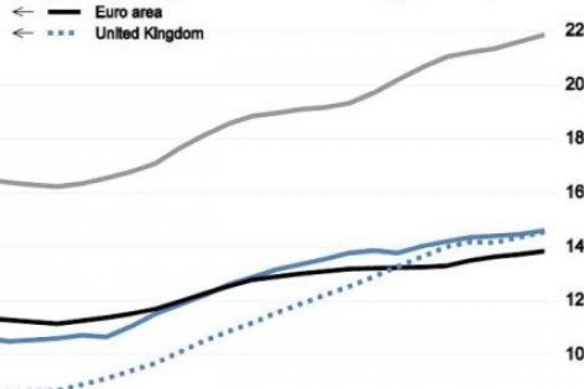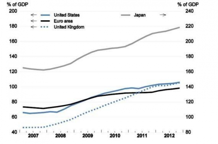 Acelerar la transición a la unión bancaria es una condición necesaria para que esa renovada desconfianza desaparezca, pero no es suficiente. La eurozona necesita crecer, y para ello, como admite la OCDE, han de flexibilizarse las imposiciones de consolidación fiscal, que además de ser guiadas por objetivos de reducción del déficit estructural (en lugar de hacerlo en términos nominales), han de conceder más tiempo a esos objetivos. Como se aprecia en el gráfico adjunto, las posiciones de deuda publica de la eurozona siguen siendo significativamente mas bajas que las del resto de las economías importantes, donde el saneamiento de las finanzas públicas es mucho menos riguroso que en el área monetaria europea. También al igual que hacen los otros bancos centrales, el BCE ha de asumir una política monetaria más estimuladora, dada la ausencia de amenazas inflacionistas y las amenazas todavía vivas de fragmentación financiera.