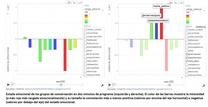 En cuanto a los estados emocionales generados en tales grupos, los analizamos minuto a minuto, tal y como aparecen a continuación. La gráfica de barras de la izquierda muestra cómo la mayoría de grupos generan emociones negativas (barras hacia abajo en la gráfica). Este fue el patrón más frecuente durante el programa. La gráfica de la derecha muestra que también se produjeron momentos en los que algunos grupos de conversación se caracterizaron por emociones positivas (barras hacia arriba) con mayor o menor grado e intensidad.