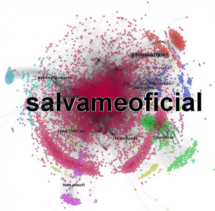 En una monitorización realizada sobre la audiencia social generada en Twitter por el programa Sálvame, detectamos los grupos de conversación mostrados a continuación. En la imagen, cada punto es una cuenta de Twitter, y su color la identifica dentro del grupo de conversación en que estuvo implicada (las líneas entre puntos son retuits o menciones entre las mismas). El programa Sálvame genera un grupo de conversación principal (liderado por la cuenta oficial del programa) y otros grupos secundarios (liderados normalmente por los tertulianos del programa).