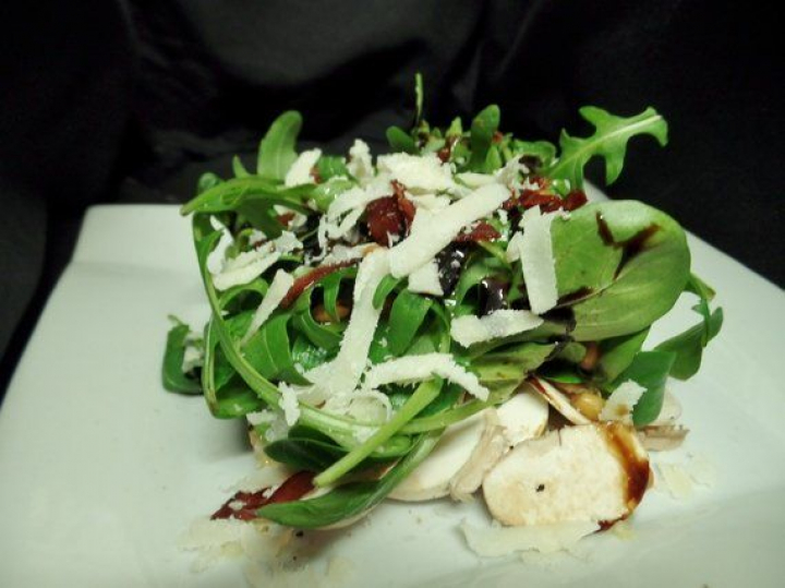 4. Emplatado: dispón los champiñones en el fondo de una fuente, salpimienta y échale un poquito de reducción de vinagre de Módena y un hilillo de aceite. Dispón por encima los brotes, salpimienta y vuelve a aliñar al gusto. Esparce los piñones y el crujiente de jamón y ralla generosamente queso parmesano.