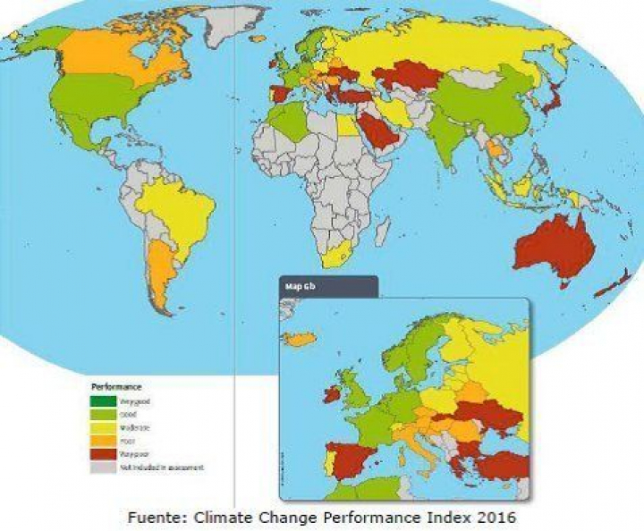 La Figura 1 recoge (en color rojo) los países que peor desempeño han tenido en los últimos años en la lucha contra el cambio climático. España figura entre ellos.