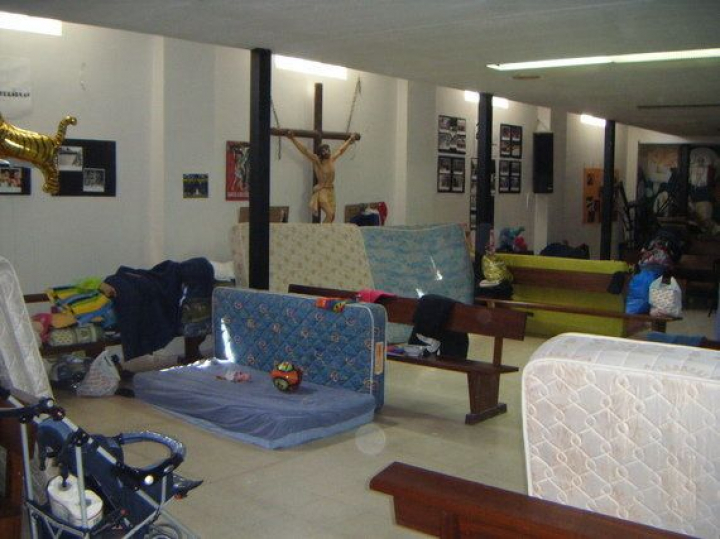 En los últimos años, sin ir más lejos, desde San Carlos se está luchando para encontrar soluciones para los gitanos rumanos que viven en el poblado chabolista del Gallinero, junto al centro comercial La Gavia, en Madrid. Donde nadie debería vivir. A las siete de la mañana grupos de voluntarios despiertan a los niños y les dan de desayunar para fomentar su escolarización. O se los llevan de campamentos, les ayudan con los deberes y se encargan de defenderlos ante los tribunales. Pero hay mucho más: reparten ropa de segunda mano, asesoran legalmente de forma gratuita, acogen a chavales en sus propias casas... "Acoger siempre", que dice Enrique. El primero fue Jacinto a principios de los ochenta, enfermo de hepatitis por culpa de las drogas, y hasta ahora. En 2008 mismo abrieron las puertas de San Carlos a veintidós bolivianos que acababan de ser desalojados de sus casas en la Cañada Real. ¡Durante días el templo se llenó de colchones! Así son. En el templo caben colchones, barras de bar para celebrar fiestas, bancos para la misa de los domingos, carteles en favor de la sanidad pública y un ropero con prendas de segunda mano.