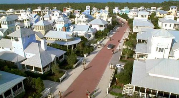 Este pueblo de Florida en el que, según sus autores, se pretendió recuperar los principios urbanísticos decimonónicos como antídoto frente al sprawl, reunía las condiciones precisas que lo hacían parecer tan artificial como un decorado. Calles interconectadas con escasez de vías rápidas para reducir el tráfico, viviendas alineadas que ofrecen una línea de fachada homogénea a la vía, líneas de arbolado paralelas, limitación del número de plazas de aparcamiento urbanas, y servicios localizados a tan solo 5 minutos de cualquier punto, Seaside pretende aportar un hogar de idéntica estructura para todo el mundo, independientemente de su condición social o económica.