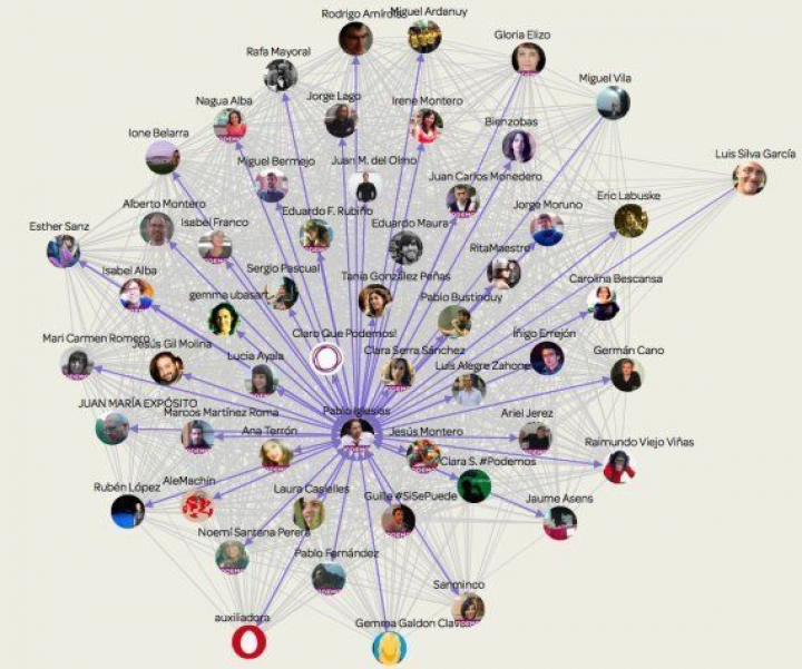 El grupo de análisis de redes Agarista, que ha monitorizando el entorno de Podemos en los últimos meses, ha detectado cómo se han articulado las relaciones entre los integrantes del Consejo Ciudadano a partir de su comportamiento en twitter. Desde el 7 de noviembre, el núcleo duro ha comenzado a seguir a buena parte del Consejo por orden de lista, sobre todo a ellas, a quienes Iglesias, Luis Alegre y Tania González han clickado esta semana una detrás de otra revelando que su designación podría responder al cupo de paridad perfecta. Tania González explica que efectivamente lo hicieron con la lista en la mano para seguirse entre todos. Lucía Ayala, del equipo técnico que ha preparado la Asamblea Ciudadana y miembro del Consejo de Iglesias, dice que "muchos no usábamos twitter, yo me he abierto cuenta hace poco, por eso es ahora cuando hemos comenzado a seguirnos". A lo que Eduardo Maura añade que menos Errejón, el resto eran escasamente activos en twitter y se manejaban mejor en facebook.