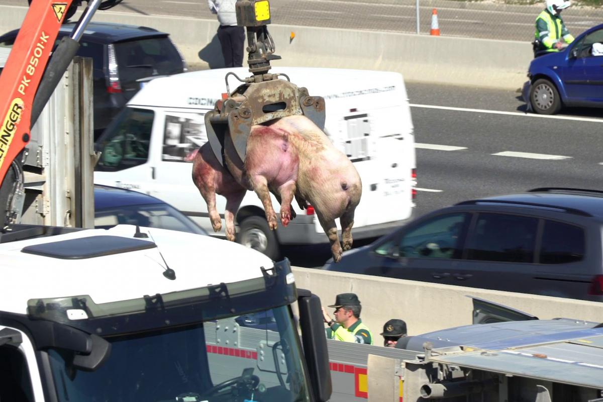 Finalmente llegó una grúa y empezó a sacar cadáveres del camión, y los pocos que quedaron con vida (murieron 130 cerdos) vimos cómo los metían en otro camión, dándoles patadas.