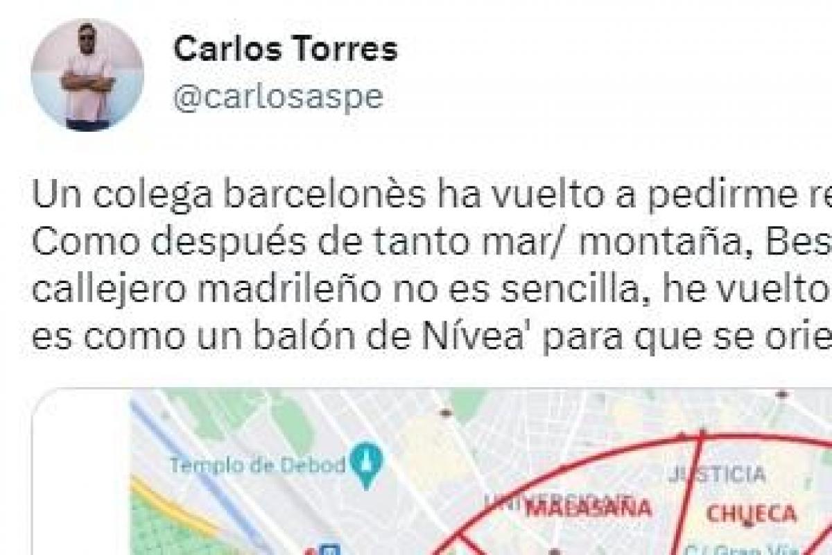 "Un colega barcelonés ha vuelto a pedirme recomendaciones en Madrid. Como después de tanto mar/montaña, Besòs/Llobregat, la anarquía del callejero madrileño no es sencilla, he vuelto a sacar mi teoría de 'Madrid es como un balón de Nívea' para que se orienten. Pobres", escribió Torres.