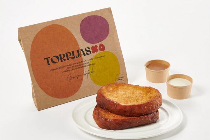 Sus torrijas están elaboradas con pan brioche “infusionadas con leche a la vainilla de Madagascar y miso blanco”. En cada paquete vienen dos unidades, acompañadas de una salsa de crema de limón y otra salsa de chocolate al mole mexicano.