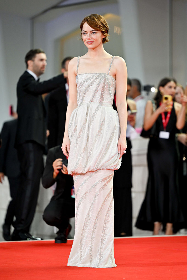 Stone volvió a acaparar todos los aplausos en la alfombra roja del festival, en la que brilló con un vestido de Louis Vuitton, firma de la que es embajadora, plagado de apliques brillantes salpicados por toda la prenda, de escote cuadrado y falda abullonada.