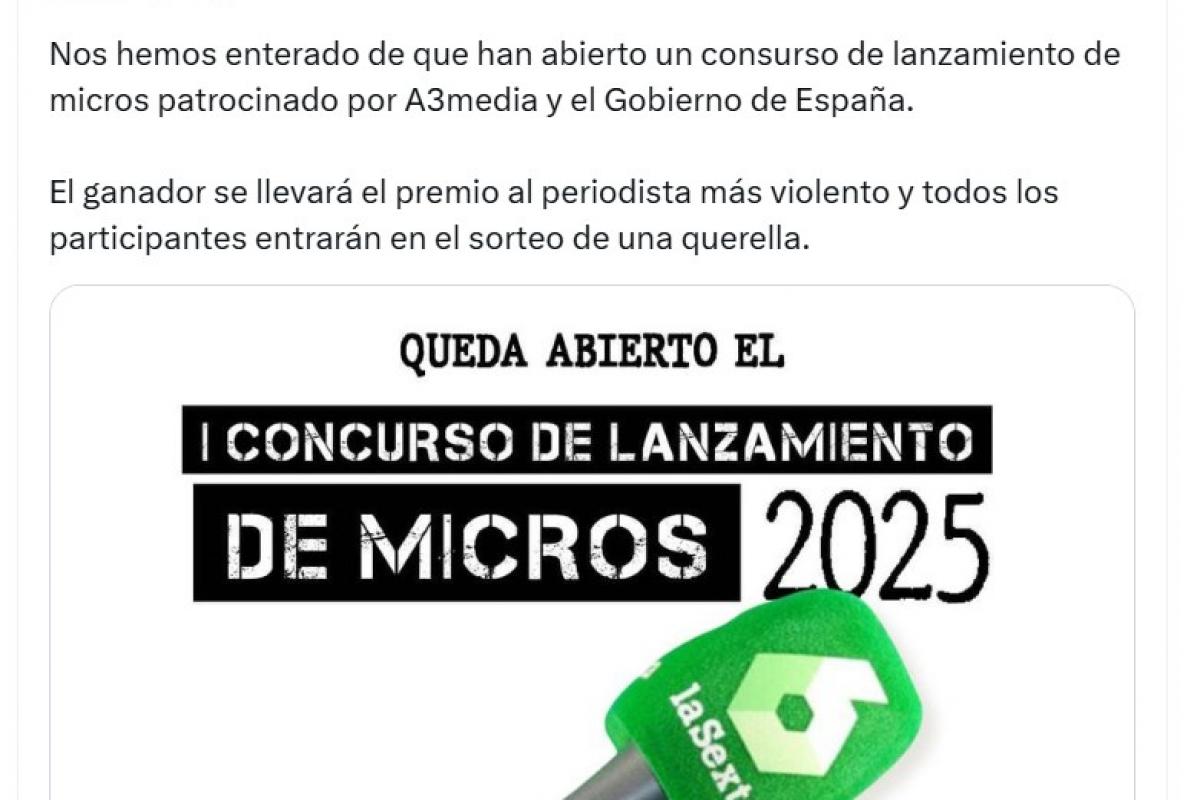 El tuit, publicado en la cuenta oficial de Vox, da por iniciado un "concurso" de lanzamiento de micrófonos, y marca como objetivos directos los de La Sexta, TVE, Cadena SER o Canal Red. "El ganador se llevará el premio al periodista más violento y todos los participantes entrarán en el sorteo de una querella", asegura la formación.