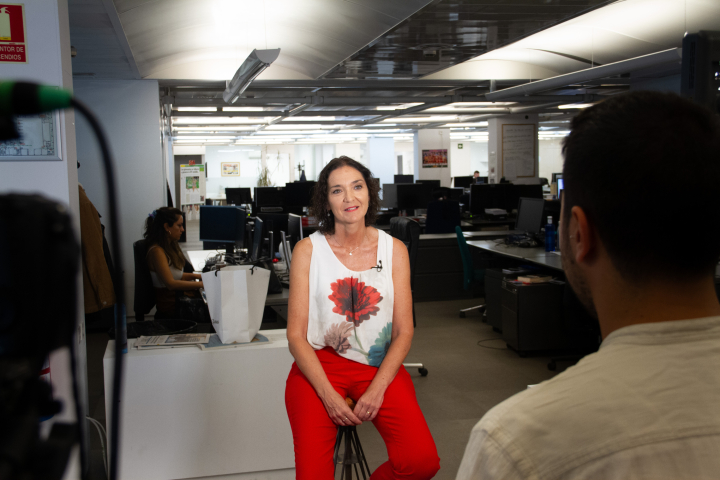 Ya microfonada, no puede evitar comentar con su equipo y la redacción el resultado que la noche anterior hizo la Selección Española. "Tenía la casa llena de niños con dos televisiones. Una para ellos y otra a los adultos", comenta hablando de las mejores jugadas del partido. Cuando impera el silencio al encenderse la cámara, su gesto cambia y empieza a disparar contra Almeida y su gestión tras un año de oposición.