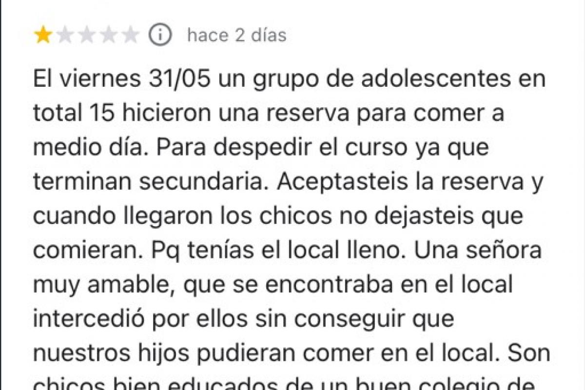 "El viernes 31/05 un grupo de adolescentes, en total 15, hicieron una reserva para comer a medio día. Para despedir el curso ya que terminan secundaria. Aceptasteis la reserva y cuando llegaron los chicos no dejasteis que comieran. Porque tenías el local lleno", se queja la clienta.