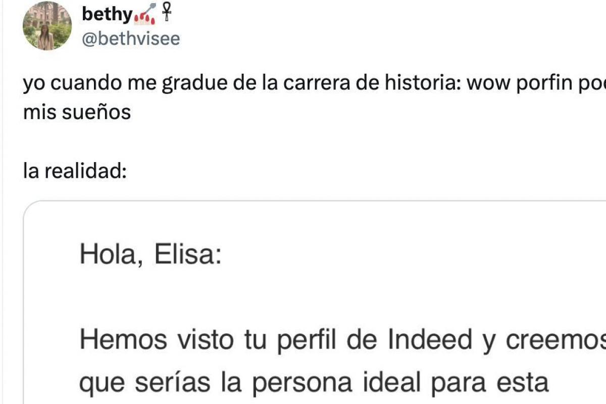 "Yo cuando me gradué de la carrera de historia: wow por fin podré cumplir mis sueños", pero la realidad es otra. O eso ha dicho ella misma cuando ha enseñado la recomendación de empleo que ha recibido, que poco o nada tiene que ver con lo suyo.